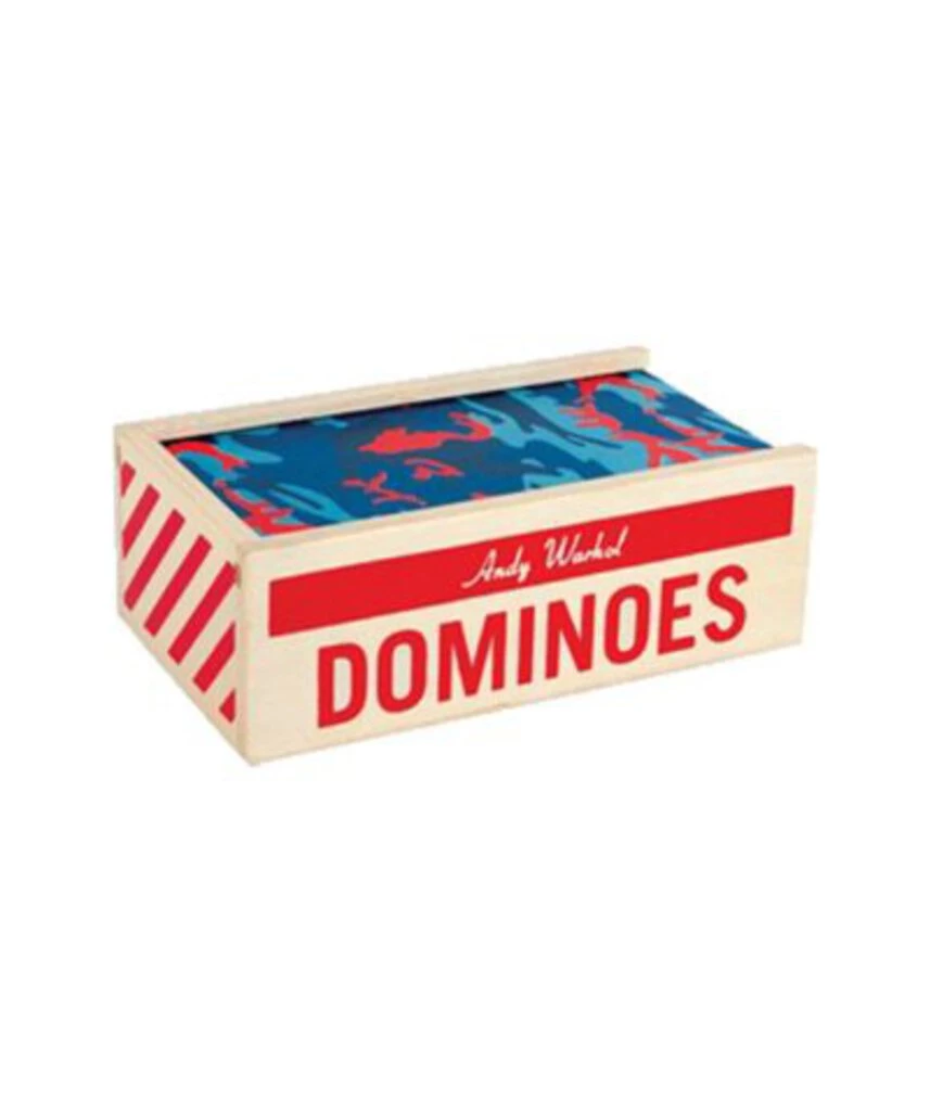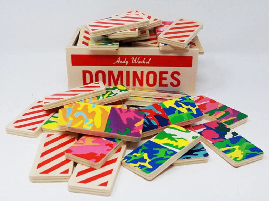Andy Warhol Wooden Dominoes set includes 28 sturdy, wooden dominoes featuring Warhol’s iconic camouflage art. This colorful way to play dominoes is very unique, just like the artist himself! The wooden box with sliding lid is perfect for storage or gifting to any Warhol fan.
