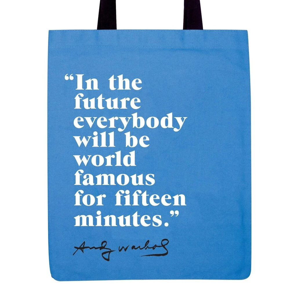Carry this bag in style! The Andy Warhol Foundation Marilyn Monroe Tote Bag features Warhol’s iconic illustration of the famous actress on one side and Warhol’s quote “In the future everybody will be famous for 15 minutes” on the other side. Also included are 3 different limited-edition buttons: Banana, Andy Self Portrait, and quote, “All is pretty.”