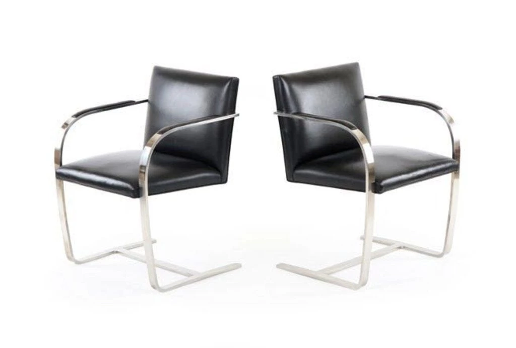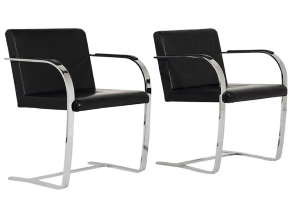 Be buoyed aloft on chrome cantilevers in these classics of high modern design, a pair in the manner of the famous Brno Chair. Ludwig Mies van der Rohe and Lilly Reich collaborated on the original design in 1927 for Mies’ full-concept design Villa Tugendhat in Brno, Czech Republic, from which location the chair style takes its name. Lateral arcs of steel like reverse C-shapes form arms, legs and structural support in a single polished piece, an object lesson in modernist reductionism and form-function efficiency. Brno’s in the Tugendhat House were made of tubular steel, all except one example in the bedroom, which, like these, featured flat-bar steel construction. The flat-bar remained a one-off until 1958, when architect and Mies-devotee Philip Johnson set in motion its mass production. Upholstered in soft black leather (or almost-leather), these slick classics offer a seat as smooth as their design. Vintage, sold as a pair.