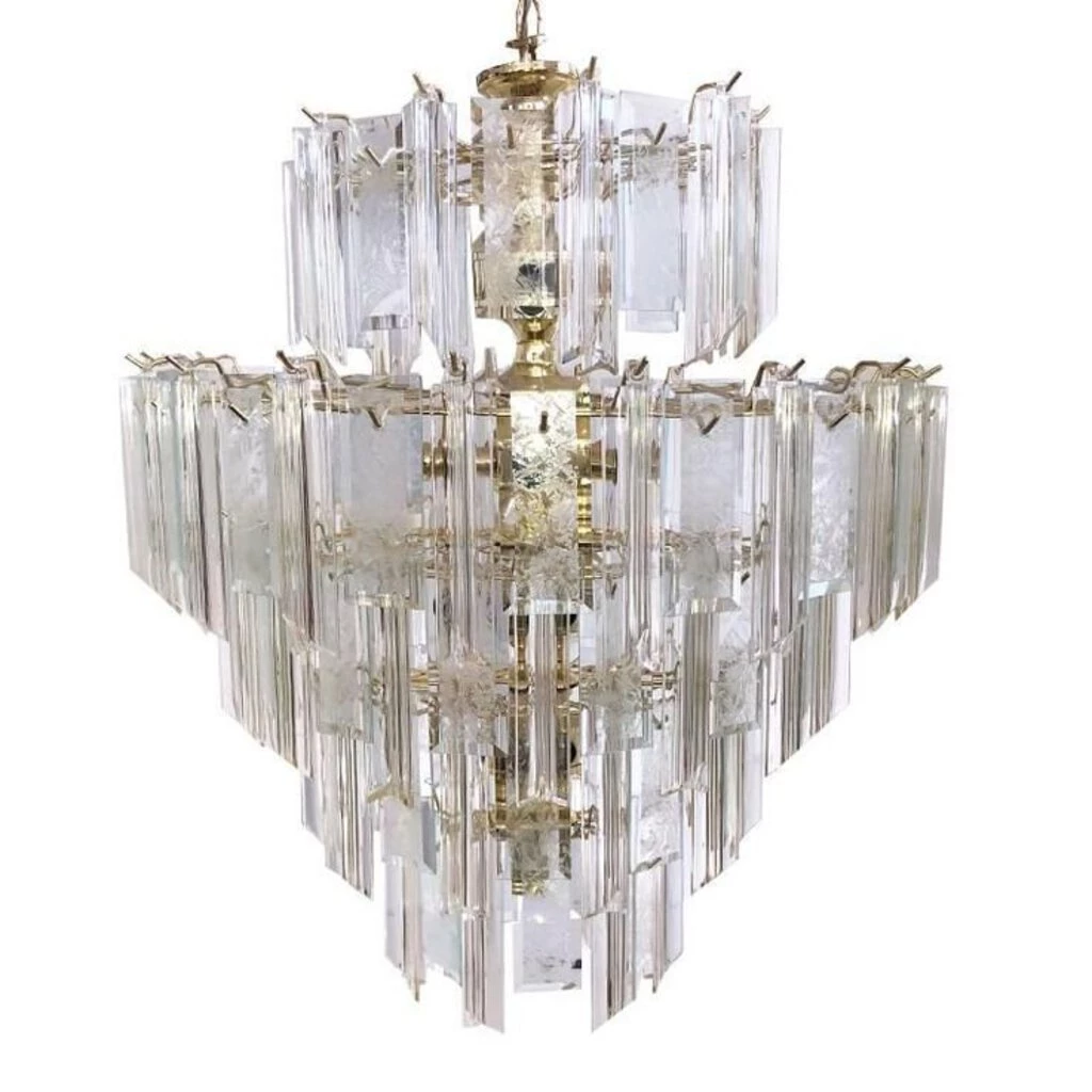 Like a gleaming Guggenheim suspended on a celestial chain, this vintage modern chandelier brings a mid-century sensibility to classical splendor. Alternating glass and lucite – beveled baguettes and triangular prisms, respectively – in five descending tiers refract the light of 17 bulbs, all on a brass-finish interior scaffold. Clean lines and clarity of light make this an elegant addition to a wide range of modernist interiors, from atomic modern to art deco revival.