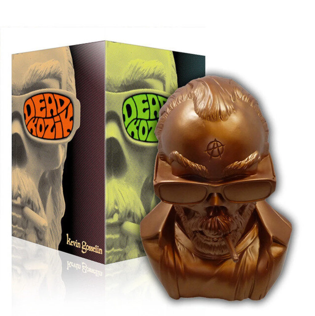 By Kevin Gosselin The tables are turned on iconoclast toy designer Frank Kozik as he becomes a giant vinyl bust. The Dead Kozik Bust was designed and sculpted by Kevin Gosselin for the Kozik Tribute Show at the 1 AM Gallery in San Francisco in 2012. After receiving an overwhelming response from the art community and successfully funding a Kickstarter campaign, Kevin brings a scaled up vinyl version to production. Originally standing at a modest 13 inches, the bust now towers at 15. With box art designed by the man himself, Frank Kozik, these busts are a must have for any Ultraviolence art collector. 15 Inches Tall Rotocast Vinyl Limited Edition of 50 pieces