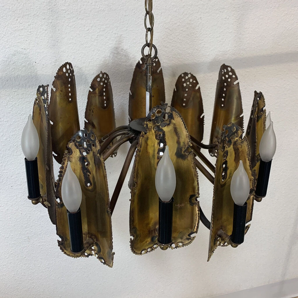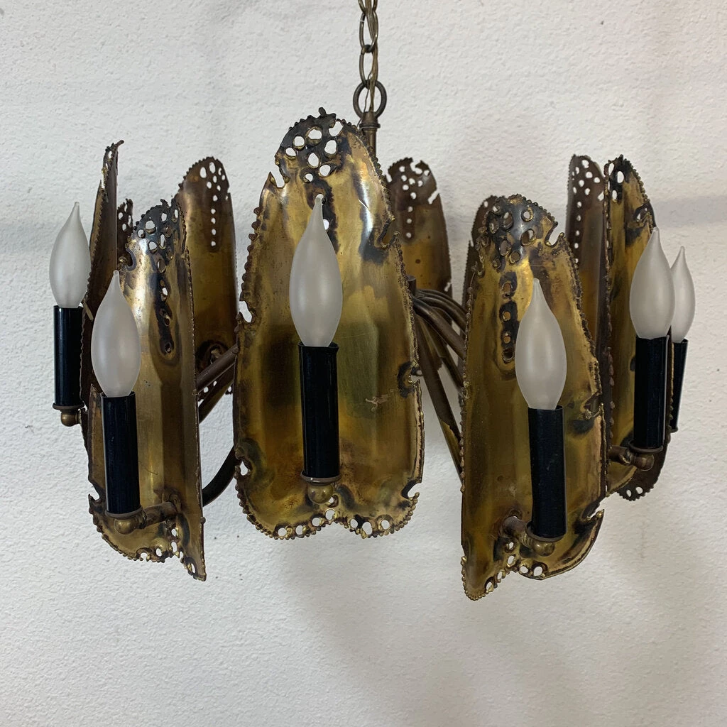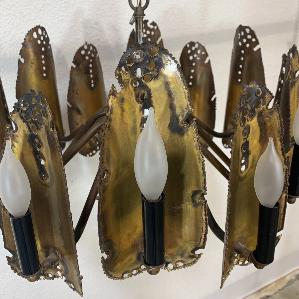 In the booming, atomic America of the 1950’s, designer Tom Greene took an incendiary approach to sculptural objects: taking a octylene torch to sheets of brass, Greene pioneered what would come to be called (with some justification) the Brutalist style. Today his impressive lamps and sculptures can be seen in hotels and private collections. The welding flame scorches the finery of brass, blasting its surface from gleaming clean to an oiled patina of industrial fallout. But the fiery edge of Green’s technique belies the finesse of his forms – floral, frequently, or fronded like lilies, especially for chandeliers. The result is a traumatic amalgam redolent of its era: biology and technology, growth and disease, beauty and brutality – the bomb, the nuclear family, atomic modernism, and the global conquest of American aesthetics. This chandelier arranges 12 bulbs in a radiation of sconces around a single downward-facing light. Great condition with vintage patina.