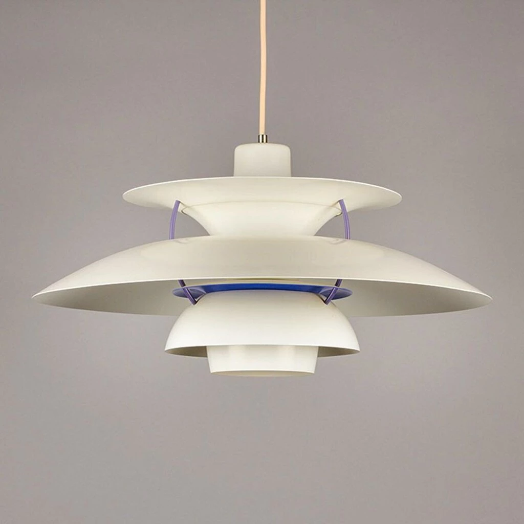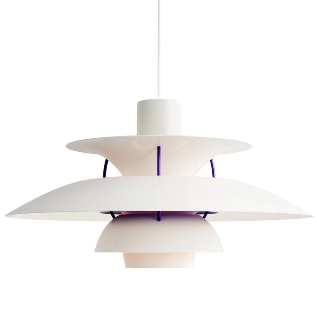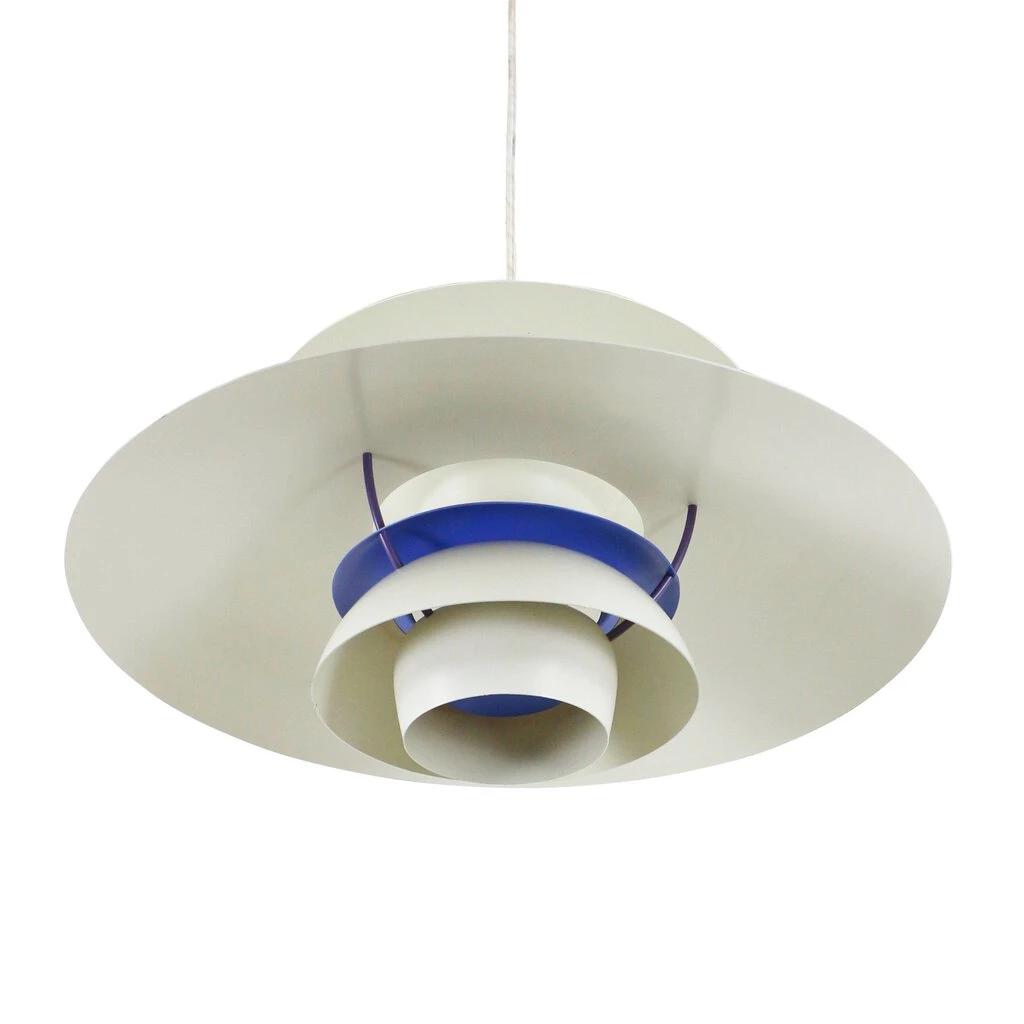 Already in the 1920s, designer Poul Henningsen had developed a system of shading in multiple horizontal bands in order to soften and diffuse the light from electric bulbs. Having been raised without electricity in a rural Danish village, Henningsen preferred the glow of gas lamps to the comparative harshness of incandescent filament lighting. With his first so-called “Paris lamps” in glass, Henningsen won major awards for Louis Poulsen & Co, for whom he would continue to refine his lighting design over the following decades. The PH series, named for his initials, is his best known, and includes both the PH Artichoke and this lamp, the PH 5. Composed of floating circular metal louvers reflecting the light of an interior bulb, the PH 5 applies scientific principles to Henningsen’s quest for soft and salutary illumination. This version is the Classic White—although most visible surfaces appear in the quintessential white of Modern design writ large, blue and red interior surfaces enhance the light at the far ends of the visible spectrum (red and blue), while mitigating the green-yellow glare of the most readily visible light. Much beloved and often imitated, the PH 5 Pendant Light has been in continuous production since its debut in 1958. Astonishing for its versatility, the PH 5 is equally at home in domestic, commercial, and industrial settings, and has remained steadfastly tasteful since its debut. Our lamp is in gorgeous condition, and includes original Louis Poulsen stickers on its interior.