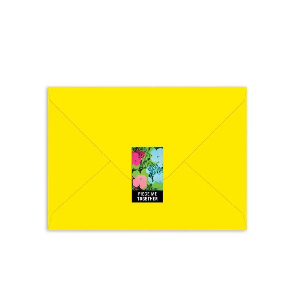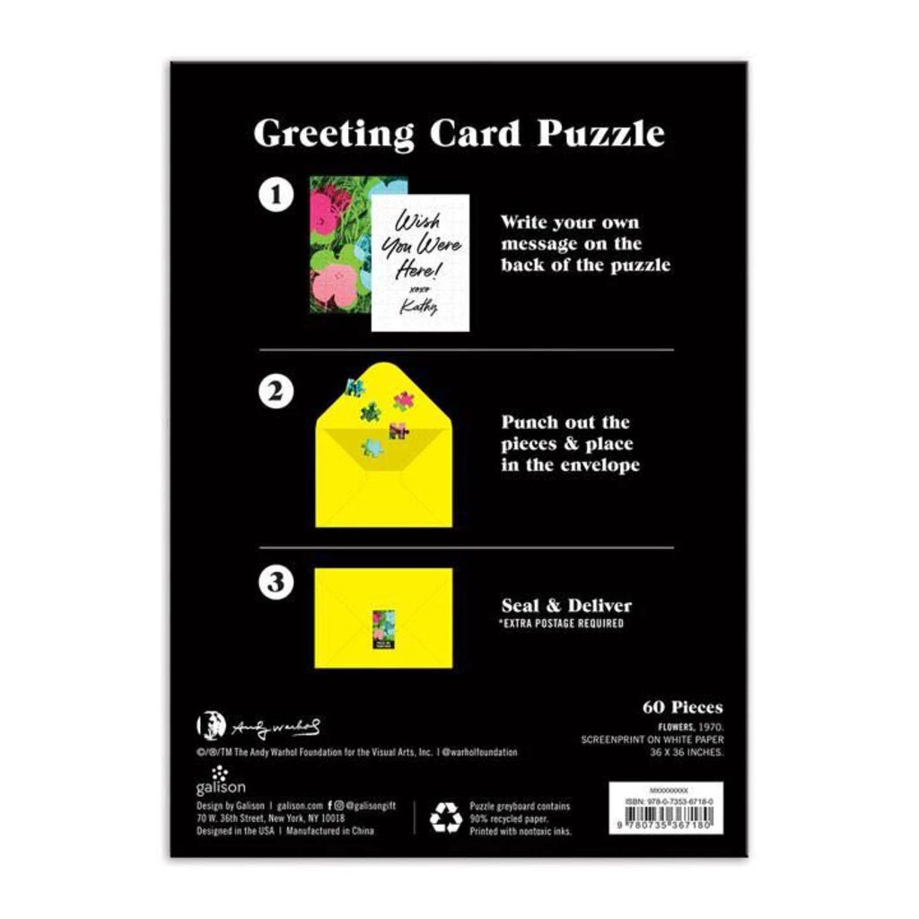 The Andy Warhol Flowers Greeting Card Puzzle is a 60-piece postcard puzzle featuring the iconic Andy Warhol Flowers series from 1970. The package comes with the puzzle fully assembled. Write the message on the back, break up the pieces, place in the envelope, and mail.