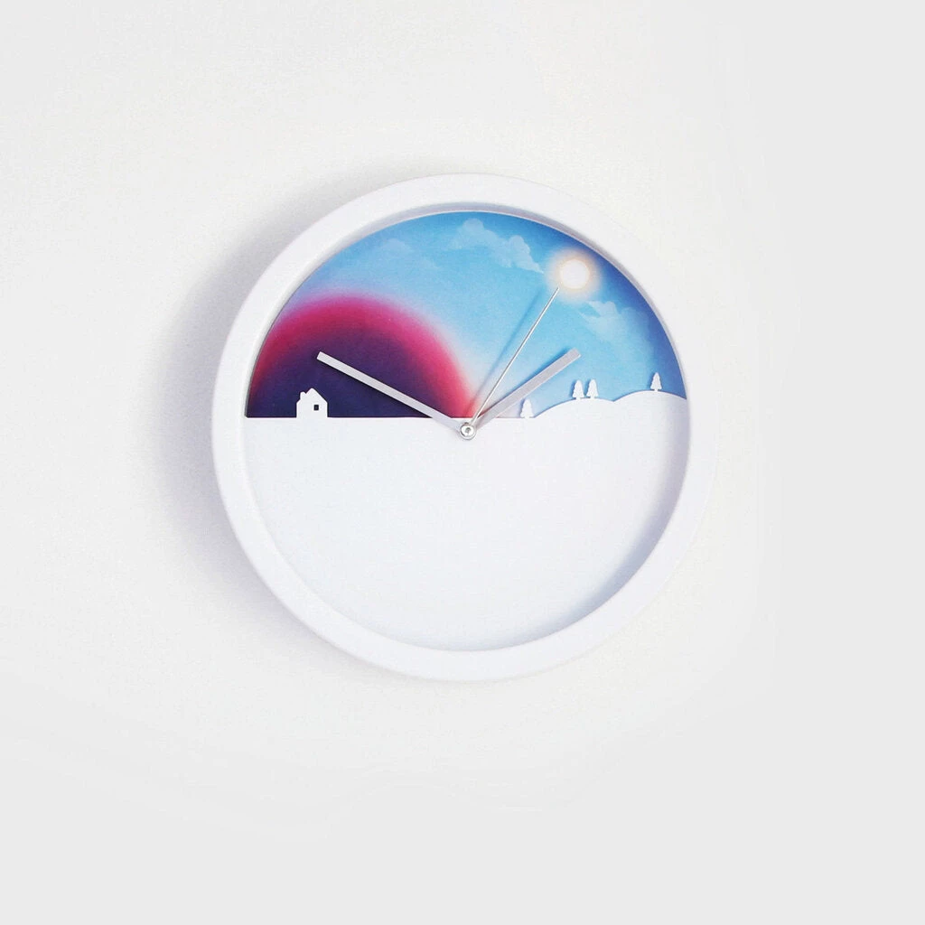 Experience time in harmony with the rhythms of sun and moon, star and sky. Hang this unique clock on the wall and enjoy the view from dusk ’til dawn. The skyline gradually rotates as the hands move, so what you see on the face always matches the daylight outside. Spans a full 24 hours. The perfect gift for clock watchers.
