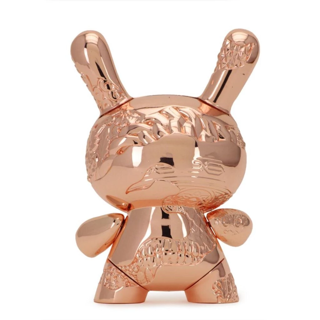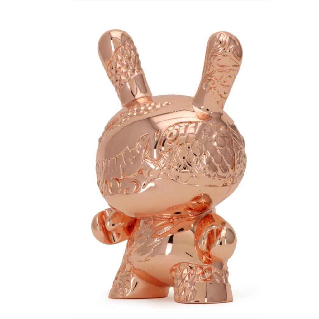 Following last years sold out 15th Anniversary New Money Metal Dunny release, Tristan Eaton returns to Kidrobot to create the second edition of the 5-inch New Money Metal Dunny with the Rose Gold Edition. Etched into rose gold colored metal and decorated in iconic Tristan Eaton style, this Dunny redefines the limits of the forever recognizable art platform created over 15 years ago. Transcending art from canvas to metal art toy, this Dunny stands as an honorary piece to the last 15 years the Dunny has given dedicated artists and collectors a creative platform. Limited to 1000 pieces worldwide.