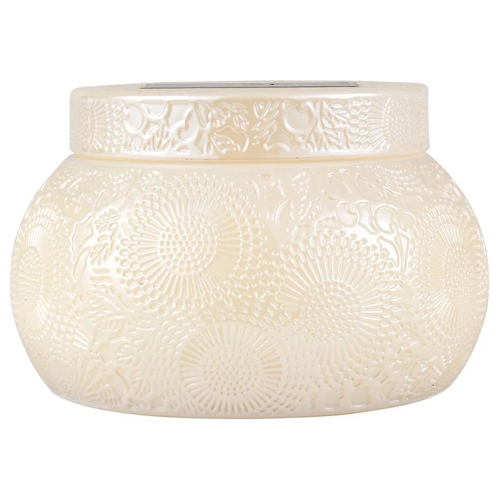 Its richness in both aroma and design is showcased in a lidded glass bowl; an ode to Japanese beauty. Embossed with salient detail, the container is a perfect centerpiece while accessorizing a space, as the clean burn delivers fragrance to every corner.