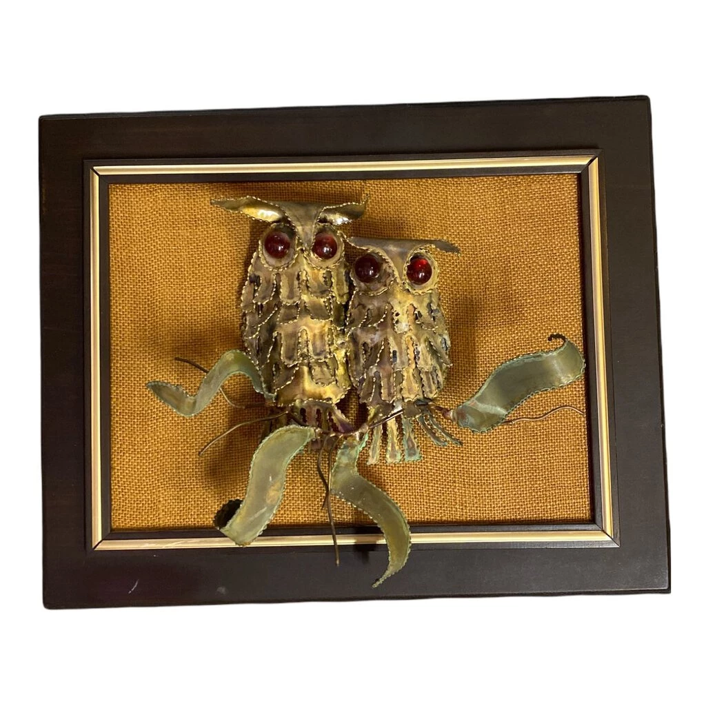 HausOfRex Mid Century Brutalist Owl Duo On Burlap In Walnut Frame