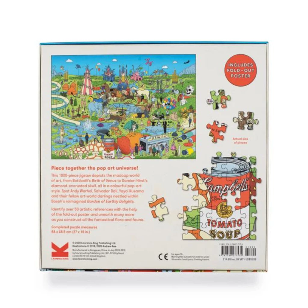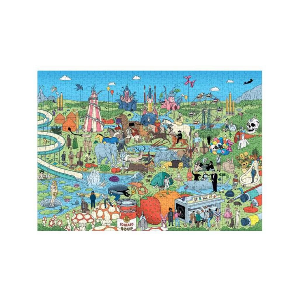 • 1000-PIECE PUZZLE featuring a madcap pop art scene in fantastic detail, ranging through time from the Dutch masters to Kusama’s dots