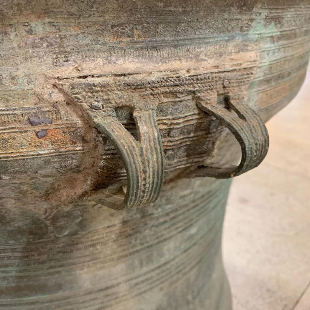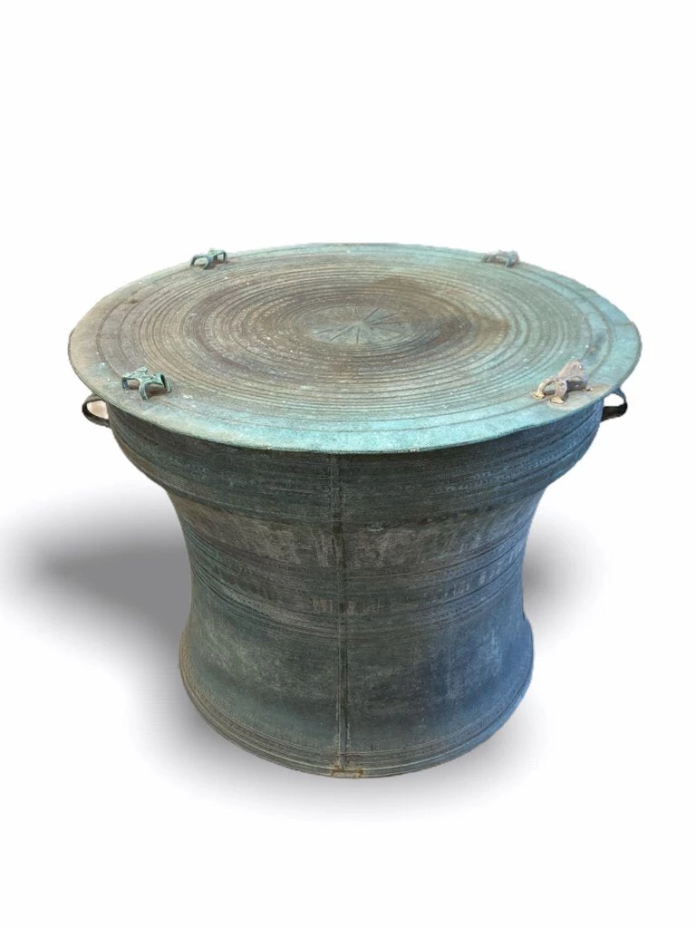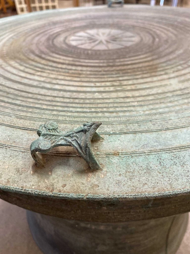 A wonderful & eerie sound is created when Asian Bronze Rain Drums like this one are struck by the heavy monsoon rains of Southeast Asia. Asian bronze rain drums are believed to contain an array of Lucky Spirits, ranging from fertility and wealth through to death (they were often placed in the burial mounds along with the corpse). They were believed to ensure that a good harvest would prevail each year. As here, frogs are depicted because the Thunder God is afraid of frogs. Others believe that the frogs also represent rain; during April the frogs croak loudly, and people feel happy.