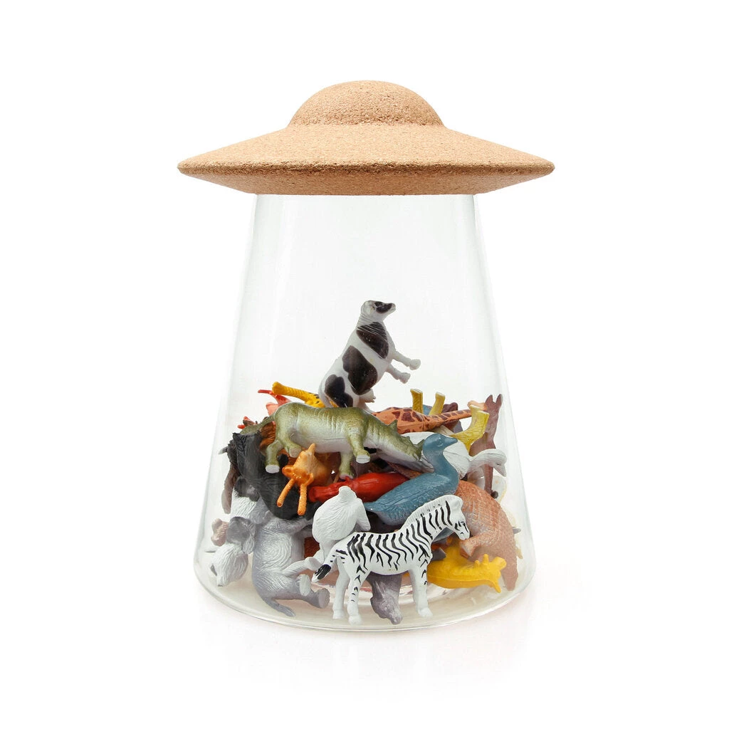 A glass storage jar with a solid cork UFO lid. The subtly green-tinted glass moulded to shape of a light-beam will make the contents appear to have been abducted by an alien life form. Perfect for cookies, sugar cubes, cereal, pasta, tea, coffee and any other small items that need a home. Design by Nick Forrester