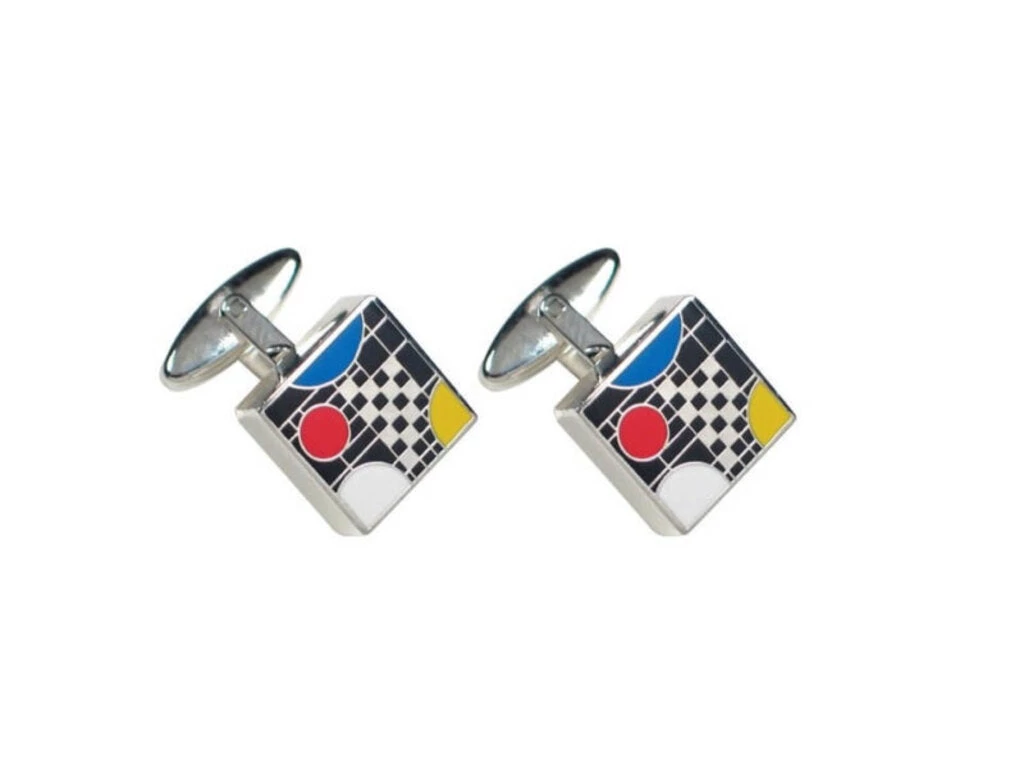 This design by Frank Lloyd Wright is part of our unique Cufflinks collection. The design has silver line work with red, yellow, and blue accents on a black background that are reminiscent of the windows in the child’s playhouse designed by Wright for Avery Coonley in the suburbs of Chicago – representing balloons and confetti in a Fourth of July Parade. The design is made of cast zinc alloy with colored enamel. The cufflinks are packaged in a black box with the designer’s bio card. Frank Lloyd Wright is considered to be one of the most iconic American architects of all time. Wright believed in designing structures that reflected humanity and its environment. He called this philosophy organic architecture, which was best exemplified by Fallingwater, one of the most famous works of American architecture. His innovation was exemplified in many structures including offices, churches, schools, skyscrapers, hotels, and museums. He also designed various pieces of furniture as well as stai…