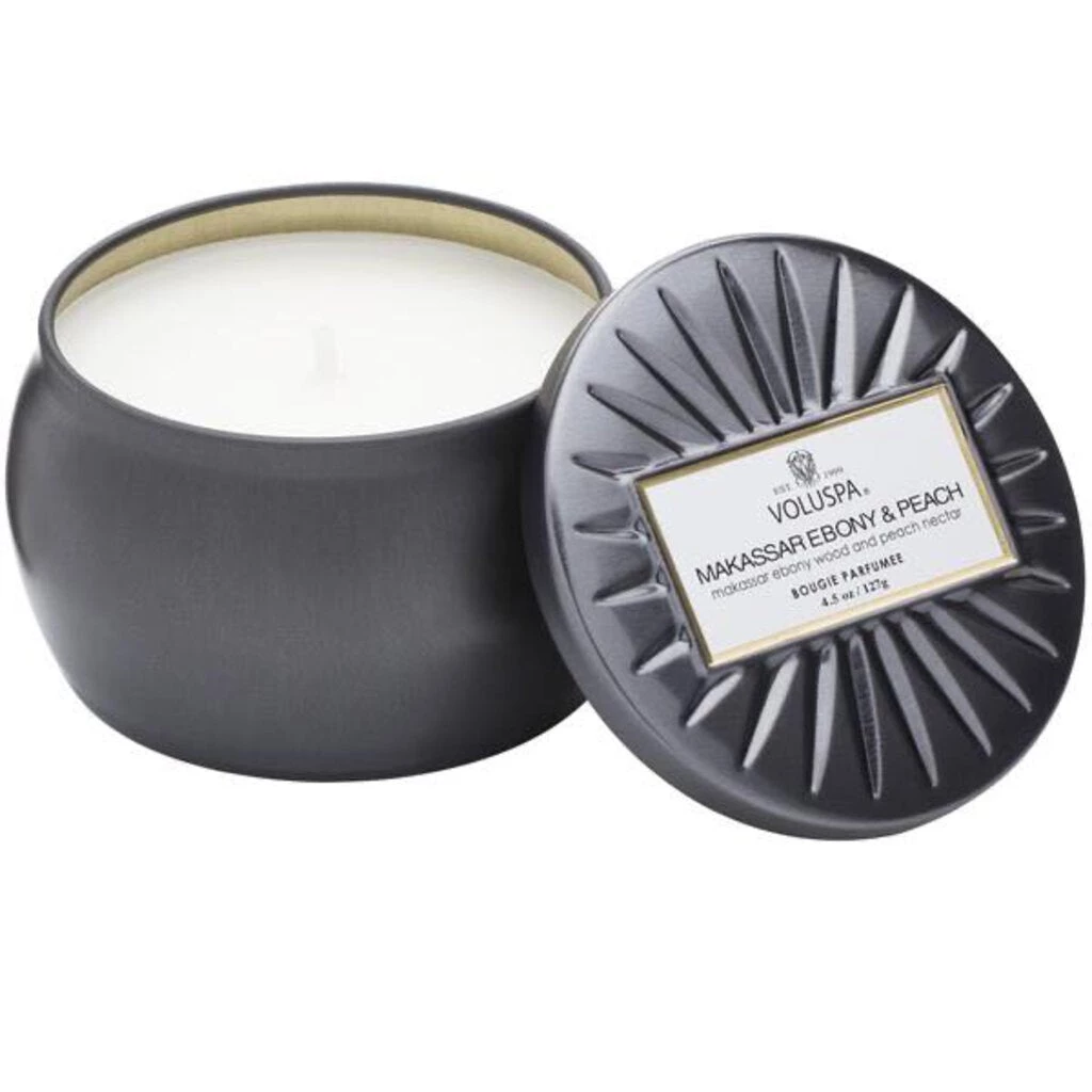Voluspa MAKASSAR EBONY & PEACH Petite Tin Candle Looking Playing Loving